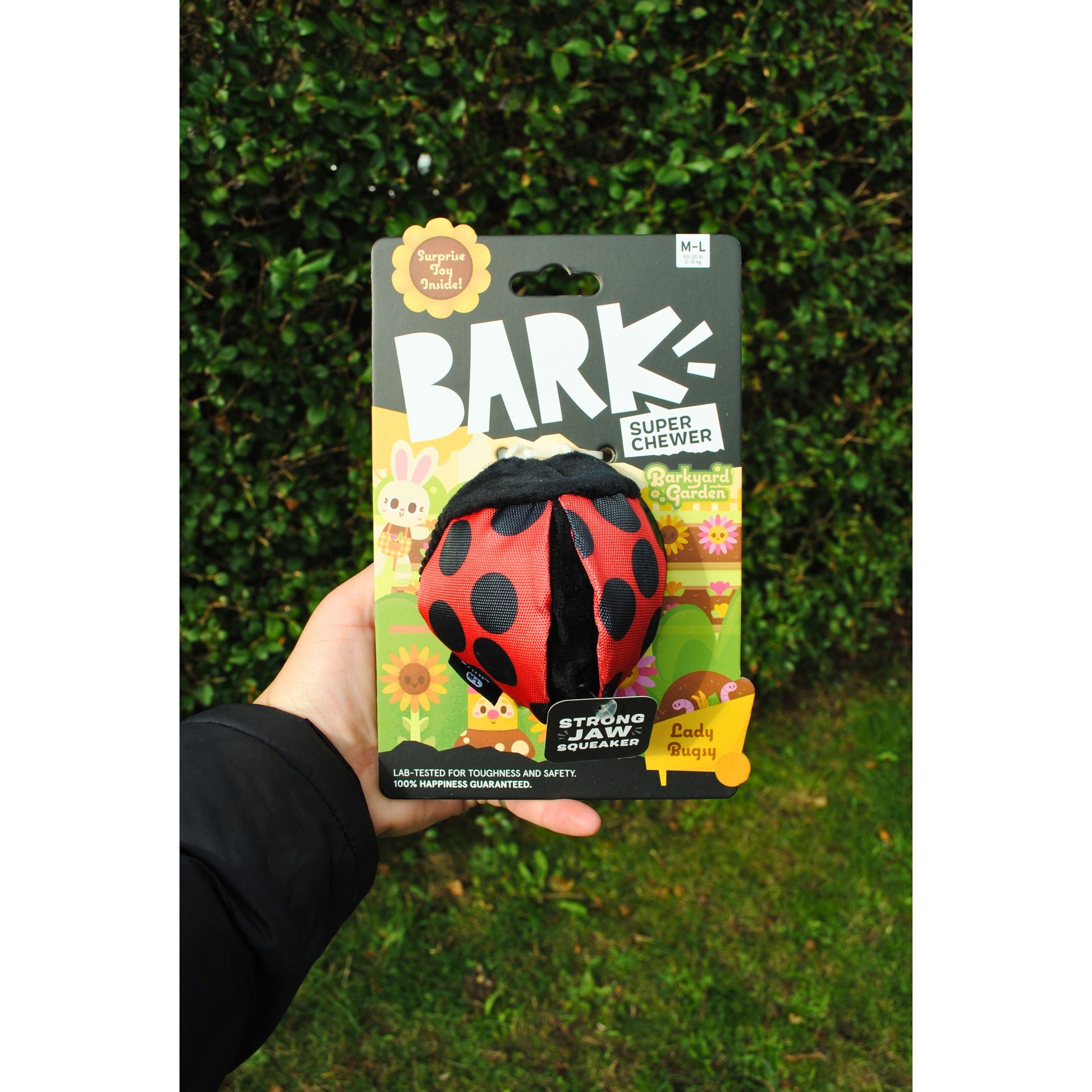 This rubber ladybug dog toy is the shell of the ball! Super Chewers can gnaw on Ladybugger's tough-but-tearable fabric layer while determined chewers will find a surprise natural rubber ball inside! It's going to take more than nipping wings to get this bug to squeak! This BARK original toy is here to help your pup realign with playtime. Made by dog people, for dogs and their people, backed by BARK's Happiness Guarantee.